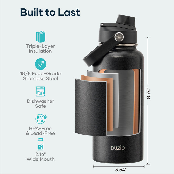 Buzio water falsk is constructed from high-quality food grade 18/8 stainless steel and BPA-free materials, and its durable construction ensures you can rely on it for years to come. And also it's LEAD FREE.